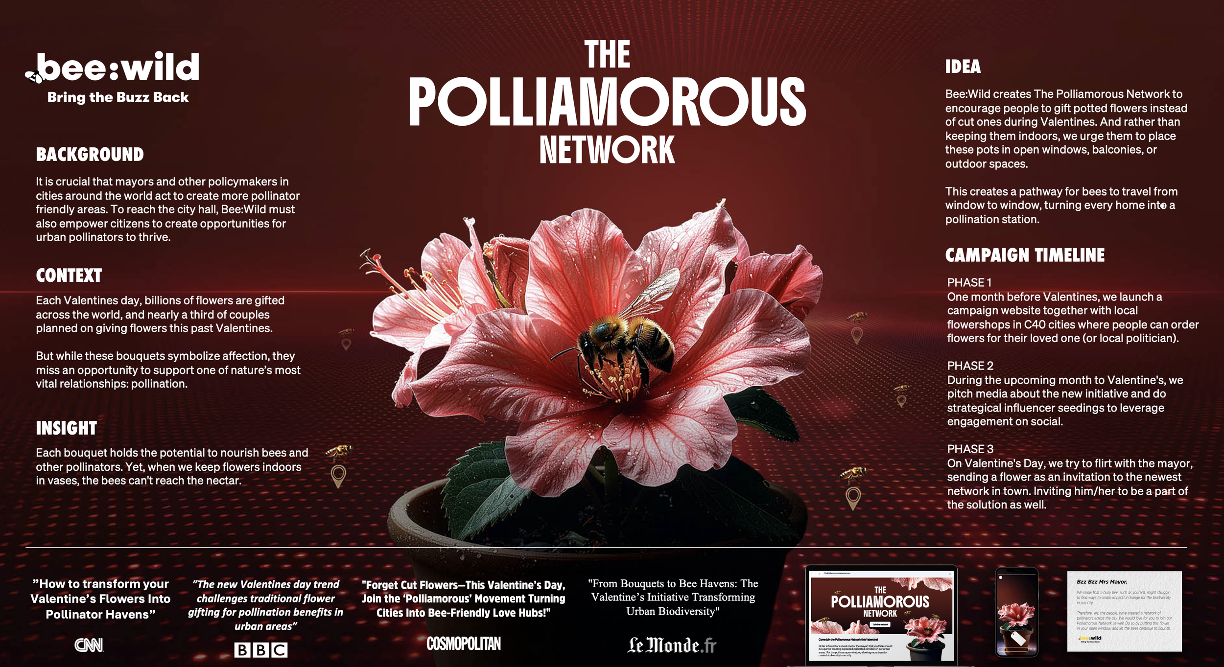 This Valentine’s Day, Bee:Wild creates The Polliamorous Network. An initiative where people are encouraged to gift potted flowers instead of cut ones, and rather than kepping them indoors, we urge them to place these pots in open windows, balconies, or outdoor spaces. This creates pollination corridors for bees to travel from window to window, turning every home (or city hall) into a pollination station.